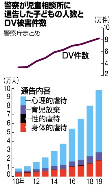 内容別では、心が傷つけられる「心理的虐待」が最も多い7万441人(前年比22・6%増)で、全体の7割。そのうちの6割は、子どもの前で親が配偶者らに暴力を振るうなどの「面前DV」によるものだった。警察が両親間の暴力などに対処する過程で明らかになったものが目立ったという。