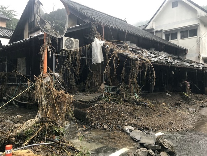やまない雨が熊本、大分、福岡3県を中心とする被災地を苦しめる。熊本南部を襲った豪雨から5日目を迎えた山あいの集落では、住民たちがわずかな食料を命綱に支え合う。コロナ禍からの奮起に燃えていた大分県由布市の歴史ある温泉街は宿の一部が損壊し、共同浴場も流失。行方不明だった旅館業の女性の死亡も確認され、湯の町に悲しみが広がった。「一体いつまで…」。週末にかけての大雨に備え、人々は後片付けの手を止め、再び避難を余儀なくされた。 【写真】一勝地地区の住民が避難する球磨川対岸の施設。わずかな食料をやりくりし、8日夜の配給は消費期限切れまであと1日のハンバーガー。消防団が被災者に届けた 記録的豪雨に襲われた熊本県南部、球磨川流域の被災地は救助や道路復旧が徐々になされ、孤立集落の解消が進む。現地は今、どんな状況になっているのか。最も被害が大きかった地域の一つ、同県球磨村の一勝地地区周辺は林道の開通で孤立状態が解消したとされるが、現場を訪ねると、依然として住民ら300人以上の危機は続いていた。物資の補給路は極めて険しい山道。住民は消費期限ぎりぎりのパンで空腹をしのぎ、こう訴える。「孤立はまだ、続いている」