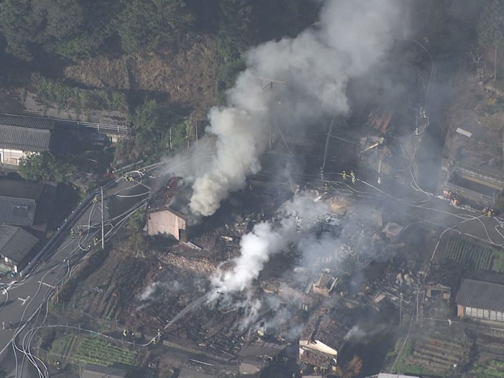 この火事で木造2階建ての住宅3棟が燃えたうえ、北側の山林に延焼。消防車15台が出動し、現在も消火活動中です。