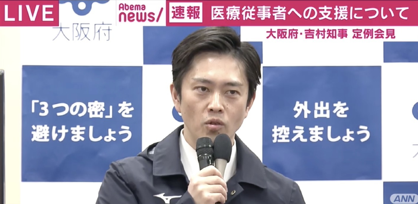 吉村知事は「異例の判断だが」との記者からの質問を受け「医療従事者の皆さんへの敬意だ」とした上で、「色々な専門家がテレビで色々なことを言っているが、ワクチンも無い未知のウイルスだから、誰も専門家はいない。そんな中、誰かにとっての大切な命を守るために自らを危険に晒しながら最前線でやってくれている医療従事者を全面的に支援するのは当然だ。異例なことをやってくれている皆さんに異例な措置を取るということ。だから大阪府が雇用主でないとしても1日3000円の特別応援手当、危険手当のようなものをお渡ししていく。あわせて民間の皆様から、“よし、応援してやろう”というご寄付をいただければ届けていきたい。すでに(「コロナ助け合い基金」に)安藤忠雄先生をはじめ、個人の皆さんからも経済的に厳しい中で“やろうじゃないか”という声を頂いているので、医療従事者の方々を支えていくべきだという輪を広げていきたい」とした。(ANNニュース)