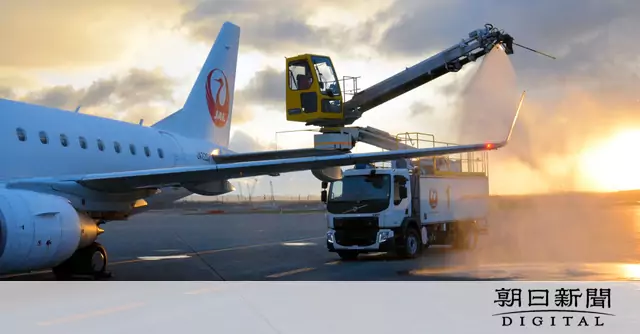 液体の主成分は食品添加物などに使われるアルコール系のプロピレングリコール。海外での使用例にならい、同空港など国内の主要5空港の作業では、今季から食紅でオレンジ色と緑色に着色した液体を使う。作業者が散布した範囲を確認でき、作業の効率化を図る目的だが、遠目では色の違いはあまり目立たない。