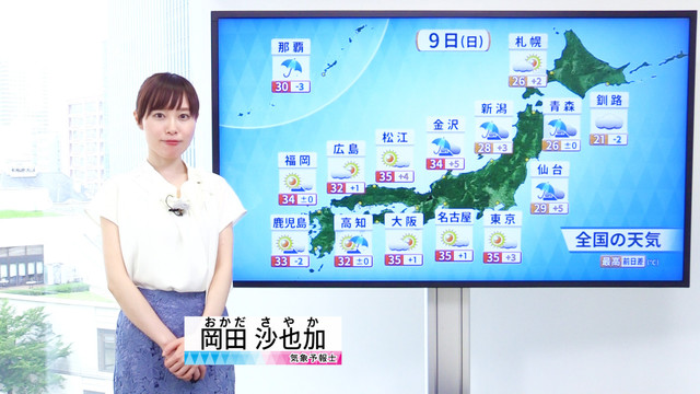 9日(日)は、前線に伴う活発な雨雲がかかる東北の日本海側を中心に大雨に警戒が必要です。また、今朝発生した台風5号は、早くも今日の日中、沖縄を直撃する見込みです。 今朝は東北や新潟県で雨の強まっている所があります。このあとも東北の日本海側を中心に、昼前にかけて激しい雨が降る見込みです。10日(月)朝6時までの予想雨量は多い所で、東北で100ミリ、北陸で90ミリと、これらの地域にとっては災害につながるおそれのある降り方となりそうです。土砂災害や低い土地の浸水、川の氾濫に警戒してください。 一方で、今朝は台風5号が沖縄のすぐ南で発生しました。沖縄本島では、局地的な大雨や落雷、強風、高波に十分注意をしてください。 関東~西日本ではじりじりと夏の日差しが照りつけますが、昼過ぎ以降は九州や四国、その他の地域も局地的に雨や雷雨がありそうです。関東は南部の方が雨の可能性が高いです。天気の急変にお気をつけ下さい。 最高気温は関東から近畿で特に高く、35℃以上の猛暑日が続出となりそうです。危険な暑さになりますので、日中はなるべく外出を控えるなど、熱中症対策を心がけてください。猛暑は少なくともお盆の間は続きそうです。 (気象予報士・岡田沙也加)