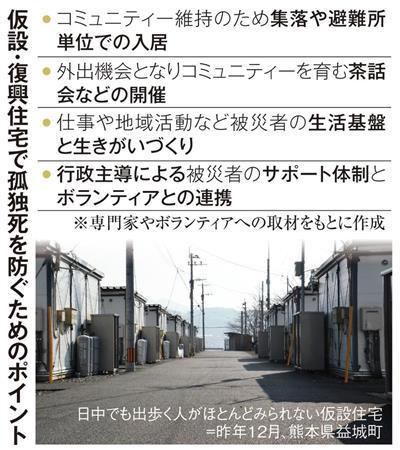 阪神以降も各地の被災地で孤独死が問題視され、経験や教訓を積み重ねてきたはずだが、今もなお「避けられた死」が積み重なっていく。「(国や自治体の)危機感のなさや被災者に対する冷たさが問題で、それを正さなければ孤独死はなくならない」。室崎名誉教授はこう警鐘を鳴らした。