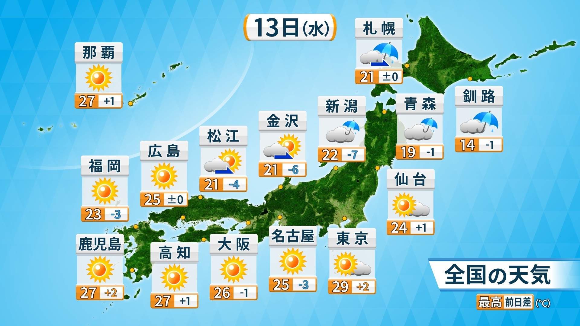 関東は12日に少し暑さが和らいだだけに、再びの暑さは体に堪えそう。湿度は低く、カラッとした暑さだが、窓を換気して室内に熱がこもらないようにしたり、冷房を使用するなど、熱中症にかからないよう注意して過ごしたい。