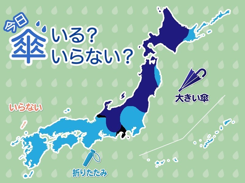 西日本や関東、沖縄県では湿った空気や前線の影響で雨が降ることがあります。外出時に雨が降っていなくても、カバンに折りたたみ傘を忍ばせておくと良さそうです。
