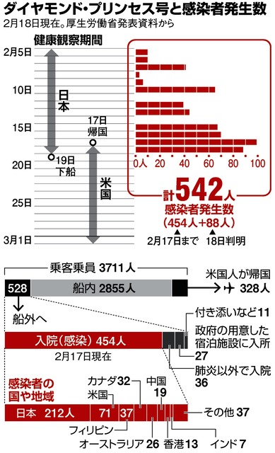 新型コロナウイルスの集団感染が起きている大型クルーズ船ダイヤモンド・プリンセス号から19日、乗客が下船を始める。検査で感染が確認されなかった人について、厚生労働省は日常生活に戻って問題がないとする。自国民の乗客を退避させ、その後も14日間の隔離を続ける米国などとは対応が大きく異なる。