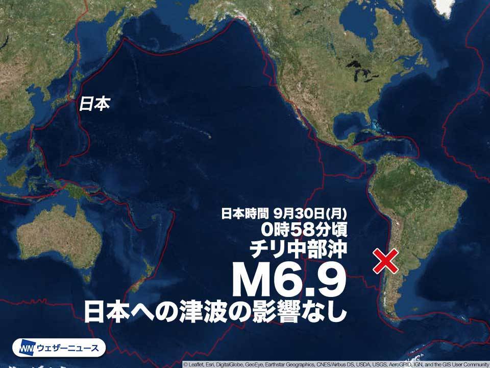 日本時間の9月30日(月)0時58分頃、南米西部、チリ中部沖で地震がありました。震源の深さは約10km、地震の規模(マグニチュード)は6.9と推定されます。(速報値)