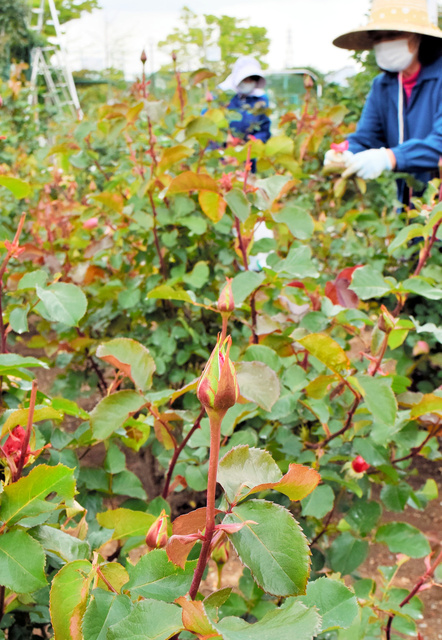 毎年5月に400種5千株以上のバラが咲き誇る埼玉県伊奈町の町制施行記念公園で、開花目前のつぼみの摘み取り作業が4月下旬から続いている。新型コロナウイルスの予防で来園者が大勢来ないようにする措置。9~31日に開催予定だった「バラまつり」に合わせ、町から委託された業者が丹精込めて育ててきた。作業していた女性は「涙が出てきそう」。