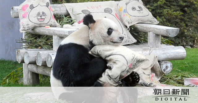 人間ならば80歳を超えている永明。お気に入りのベンチでくつろぐ助けにと、麻袋に乾燥させた竹や袋の切れ端を詰め、パンダの飼育スタッフの陣内郁佳さんがメスのパンダたちの似顔絵を描いた。