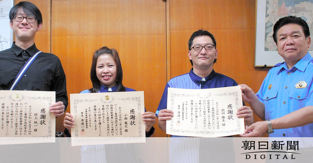 感謝状贈呈式はともに7月7日、豊岡南署であった。前田さんは「私の身近な人がネット詐欺の被害に遭いそうになったばかりだったので気をつけようと思っていた。まさか自分がその場面に居合わすことになるとは。止められてよかった」。村上さんは「一人でも被害者を減らすため、役に立てればうれしい。店長なので他のスタッフにも注意するよう伝えていきたい」と話した。