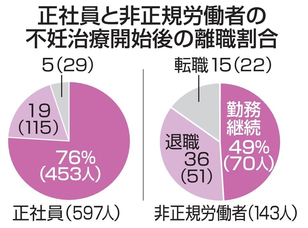 働きながら不妊治療を受ける女性の離職リスクは、非正規労働者が正社員の3.5倍―。順天堂大などの研究チームが不妊治療中の女性約1700人を対象にアンケートを行い、こんな結果をまとめた。治療と仕事の両立でも、正規・非正規の格差がうかがわれる。