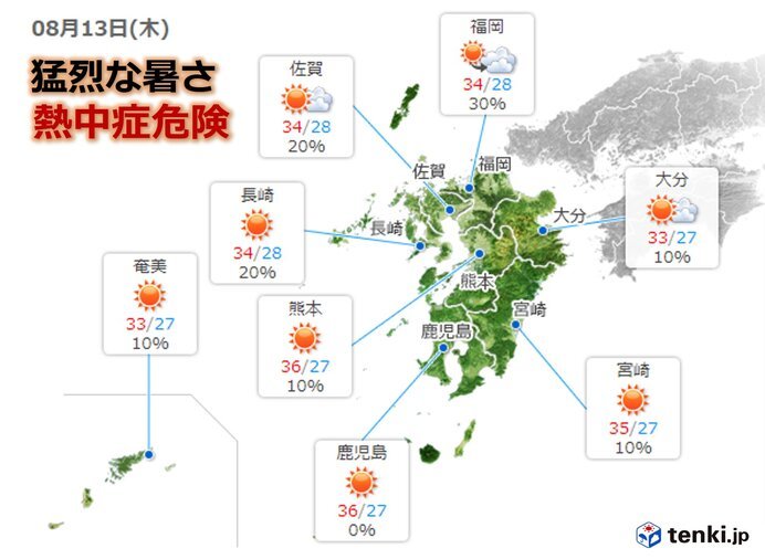 きょう13日(木)、太平洋高気圧の勢力が強まっており、九州は各地とも晴れて、最高気温は35度以上の猛暑日の所が多く、内陸部は37度台まで上がる所もある見込みです。お盆は、九州各地で猛烈な暑さになり、熱中症の危険が高い状態が続きますので、厳重に警戒して下さい。
