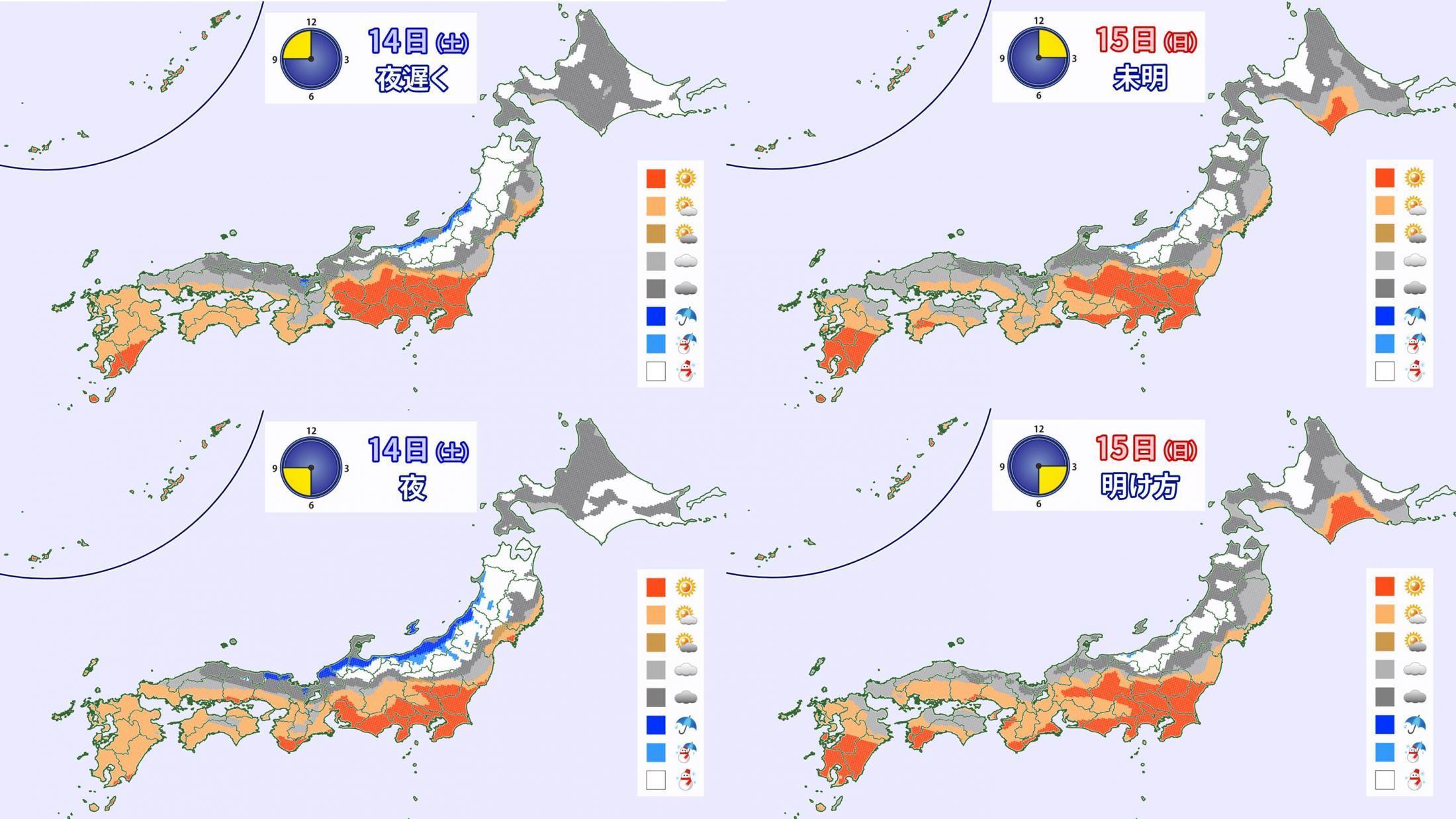きょう14日(土)は低気圧に伴う前線が本州付近を通過する影響で西日本から北日本の日本海側を中心に荒れた天気となり、夜にかけて雷を伴った強い雨や雪に注意が必要だ。