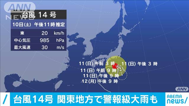 気象庁は東京の三宅村と御蔵島村に大雨特別警報を出しました。台風14号の最新情報です。 台風は、風速25メートル以上の暴風域を伴って八丈島の南西の海上を東に進んでいます。台風はこの後、次第に勢力を弱めながら進路を南寄りに変える見込みです。12日夕方までには熱帯低気圧に変わり、小笠原諸島の近海に進むでしょう。台風14号や本州南岸付近に停滞する秋雨前線の影響で和歌山県、三重県、伊豆諸島では降り始めからの雨量が所々で500ミリを超えて記録的な大雨となりました。特に伊豆諸島南部では、これまで経験したことのない大雨となった所があり、大雨特別警報が発表されています。伊豆諸島では、11日の夕方までに多い所で300ミリの雨が降る恐れがあり、土砂災害に厳重に警戒するとともに低い土地の浸水、河川の増水や氾濫にも警戒が必要です。関東地方でも11日明け方にかけて雨量がさらに増えて警報級の大雨になる可能性がありますので、十分ご注意下さい。
