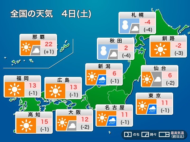今日4日(土)は西高東低の気圧配置になって日本海側を中心に雨や雪が降る天気が続きます。低気圧が接近する北陸では雷雨や突風にも要注意。東京など関東でも夜はにわか雨や雪の可能性があります。