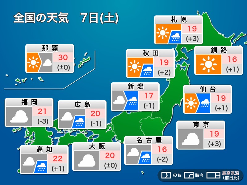 立冬の今日7日(土)は本州の太平洋側と日本海を進む前線の影響で、雲の広がる所が多くなります。前線に近い所では雨が降る見込みです。 ■ 天気のポイント ■