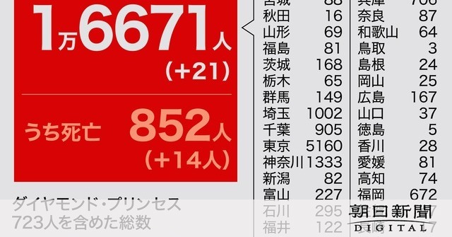 死者は全国で14人増えて計852人となった。東京都で8人、北海道で2人、埼玉、神奈川の両県で各1人が亡くなった。山梨県でも初めての死者が出た。甲府市の高齢女性で、基礎疾患はなく、当初は重症ではなかったが徐々に悪化したという。