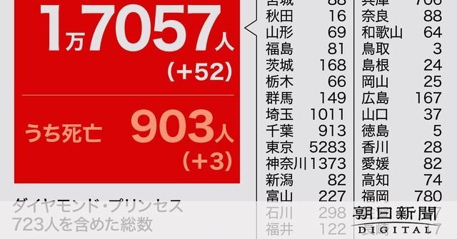 新型コロナウイルスの国内の感染者は2日、午後9時時点で新たに52人が確認され、累計で1万7057人になった。東京都では集団感染が確認されている武蔵野中央病院(小金井市)の入院患者と医療従事者ら13人を含む計34人の感染を確認。感染が再び広がっている北九州市では新たに6人が確認された。死者は3人増え、計903人になった。