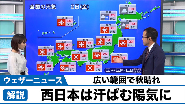 高気圧に覆われ西日本から東北の広い範囲で秋晴れとなる見込みです。 朝は空気が少し冷たく感じられるものの、昼間は昨日と同様に気温が上がり、30℃に近づく予想です。汗ばむ陽気となるので、服装でうまく調節を行ってください。