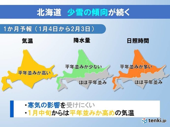 1月中旬以降は、冬型の気圧配置が弱く経過する見込みで、日本海側やオホーツク海側は平年に比べて曇りや雪となる日が少なくなるでしょう。上空の寒気の影響を受けにくく、気温は全道的に平年並みか高く経過します。残しておきたい雪も解けてしまうような日もありそうです。雪不足に悩まされている方は、しばらくは次に雪が降るのはいつになるのか、待ちわびる日が多くなってしまうでしょう。太平洋側では、平年と同様に晴れる日が多い見込みです。