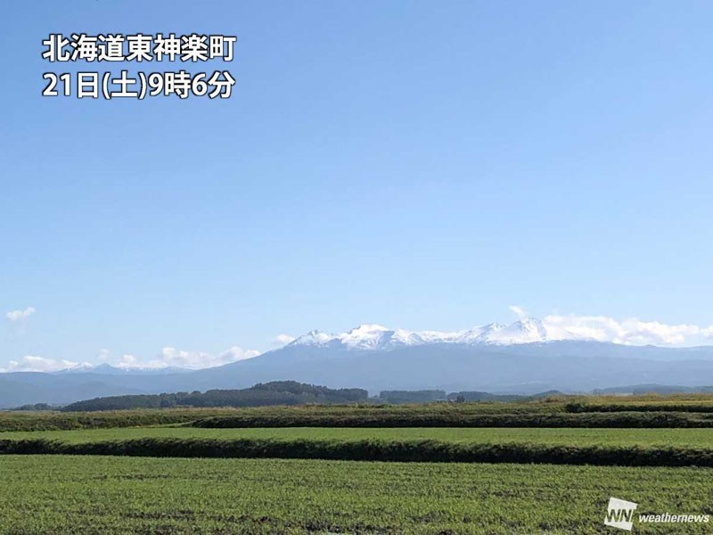 連休初日の今日21日(土)の北海道は高気圧に覆われて、各地で青空が広がっています。先日、雪が降った大雪山系も姿を現し、旭川からは旭岳の初冠雪が観測されました。