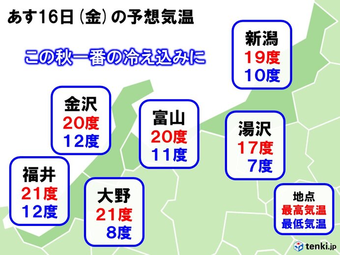きょう15日(木)の北陸地方は上空に流れ込んだ寒気や湿った空気の影響で雲が多く、午前は雨の降ったところがありました。天気は次第に回復し、北陸西部は晴れ間も出てきています。あす16日(金)は高気圧に覆われるため、広い範囲で晴れる見込みです。ただ、昼過ぎからは、気圧の谷の影響で西から雲が広がってくるでしょう。 あす16日(金)の朝は上空に寒気が残り、晴れて放射冷却現象も加わるため、冷え込みが強まる見込みです。最低気温は平地で10度から12度、山沿いでは7度から9度となりそうです。今季一番の冷え込みとなる所が多いでしょう。今夜は掛け布団を用意するなど、暖かくしておやすみになると良さそうです。日中は晴れ間も出るため気温が上がり、ほぼ平年並みの20度前後となりそうです。