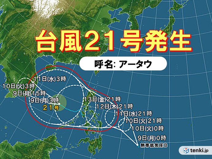 11月9日午前3時、南シナ海で台風21号(アータウ)が発生しました。今後西よりに進み、11日(水)にはカンボジアで熱帯低気圧に変わる見込みです。また東シナ海にある熱帯低気圧が今後24時間以内に発達する見通しです。
