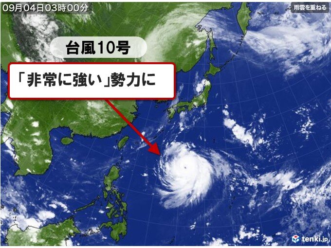 台風10号は4日3時、「非常に強い」勢力になりました。台風の強さは最大風速で決まり、「非常に強い」勢力とは上から2番目の強さです。「非常に強い」台風10号は日本の南を1時間におよそ15キロの速さで西北西へ進んでいます。今後も海面水温の高い領域を進み、「猛烈な」勢力となり、5日(土)から6日(日)にかけて沖縄地方に接近するでしょう。その後も勢力を維持したまま北上を続け、6日(日)から7日(月)にかけて奄美地方や九州に接近または上陸するおそれがあります。今後も最新の台風情報をご確認下さい。