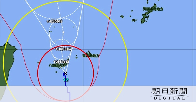 台風の影響で沖縄地方では非常に激しい雨が降った。沖縄県竹富町の波照間(はてるま)島では12日午前9時までの24時間で352・5ミリの雨を観測し、観測史上最多を更新した。13日午前6時までに予想される24時間降水量は、沖縄地方の多いところで250ミリ。