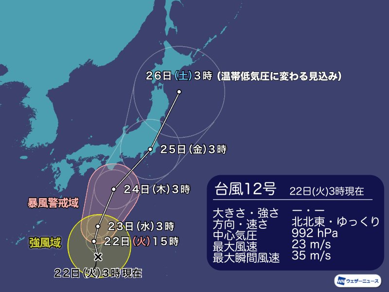 台風12号は、徐々に発達しながら日本の南をゆっくり北上中。連休明けの23日(水)から24日(木)にかけては、温帯低気圧に性質を変えながら本州の沿岸に接近、上陸する予想となっています。 ▼台風12号 9月22日(火)3時