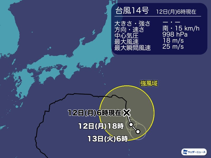 10月12日(月)6時現在、台風14号(チャンホン)は八丈島の南海上を南下しています。今日の午後には小笠原近海に達し、熱帯低気圧に変わる見込みです。 ▼台風14号 10月12日(月)6時