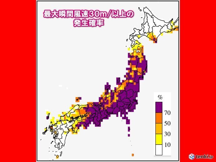 四国から関東では11日(金)午後から風が強まり、12日(土)の午後から13日(日)の午前中は30メートルどころか瞬間的には50メートル以上の猛烈な風吹く恐れもあります。13日(日)には東北でも猛烈な風が吹き荒れる可能性があります。この猛烈な風とは特急電車並みの速度で、走行中のトラックが横転してしまったり、電柱や街灯で倒れるものがあるほどの風です。屋外での行動は危険になります。