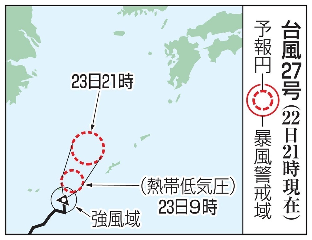 台風27号は先島諸島から北寄りに進み、23日は沖縄本島の西に達する見通しだ。気象庁は22日、うねりを伴う高波、強風、大雨による土砂災害や低地の浸水、河川の増水、落雷や竜巻などの激しい突風に警戒を呼び掛けた。