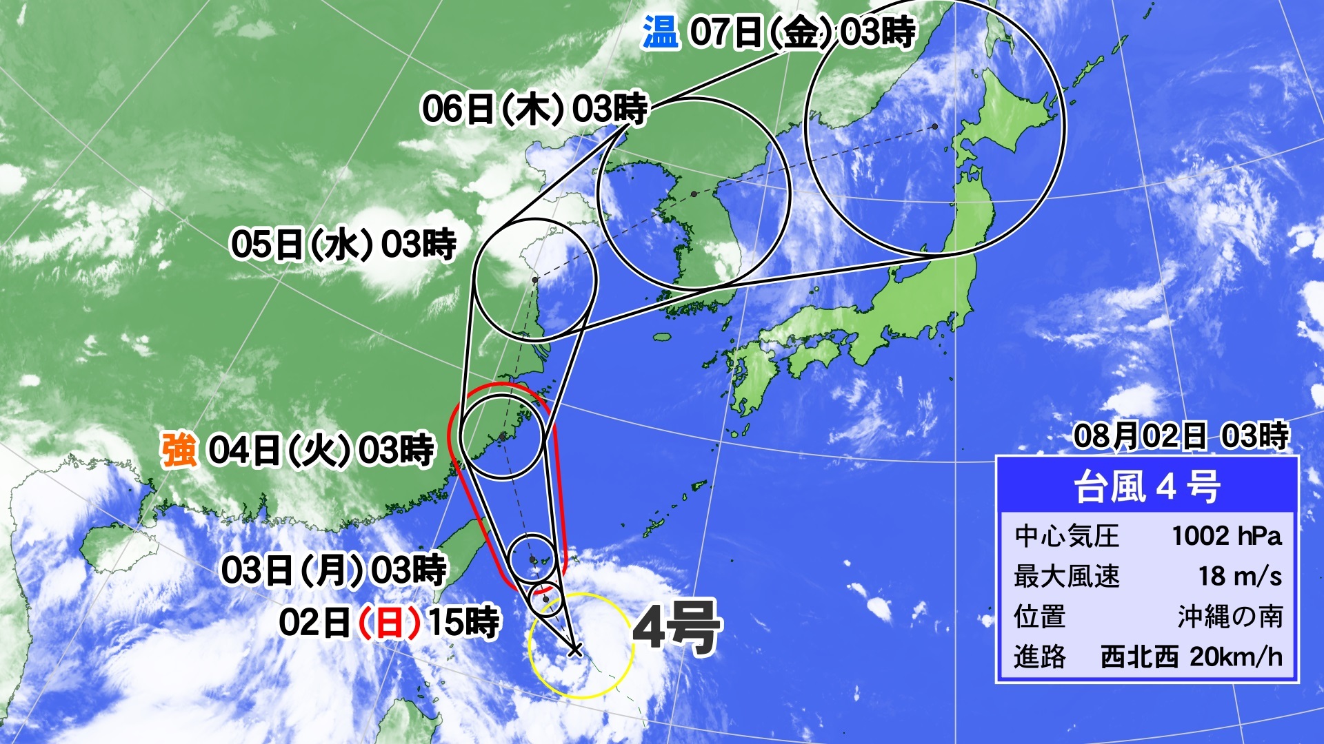 1日(土)夜に発生した台風4号は、きょうは発達しながら沖縄の南を北上し、3日未明から3日明け方にかけて先島諸島に最接近する見込みだ。先島諸島では、土砂災害や低い土地の浸水、河川の増水、暴風や高波に警戒・注意するとともに、高潮、竜巻などの激しい突風や落雷に注意が必要だ。 台風4号は2日午前3時には、沖縄の南にあって1時間におよそ20キロの速さで西北西へ進んでいる。中心の気圧は1002ヘクトパスカル、中心付近の最大風速は18メートル、最大瞬間風速は25メートル。