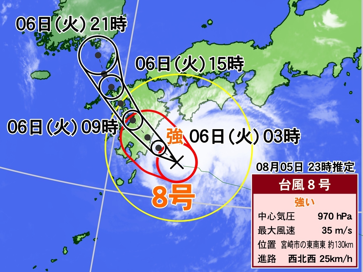 日本列島に接近中の台風8号はまだ発達を続けていて、火曜日明け方までに強い勢力を維持したまま宮崎県に上陸するとみられる。その後は夕方にかけて九州を北上していく見込みで、大雨や暴風に警戒が必要だ。
