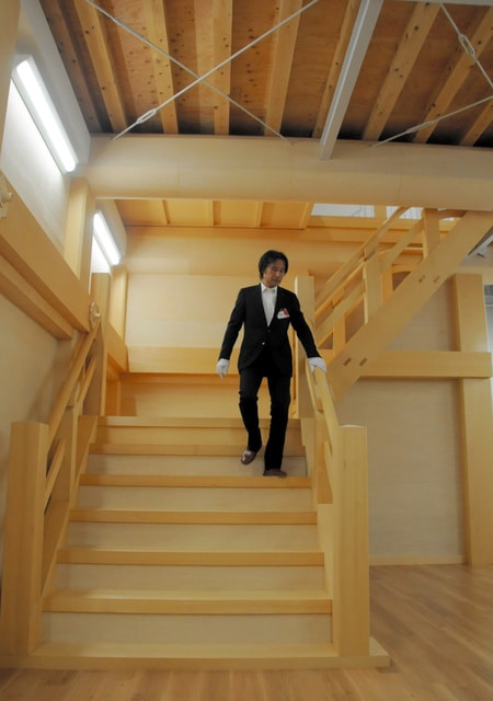 名古屋市は21日、名古屋城木造新天守の実寸大の階段模型が入る体験施設「ステップなごや」(中区三の丸1丁目)を報道陣に公開した。エレベーターに代わるバリアフリーの新技術の実験に使うために建てた。11月2日から一般公開し、実際に上ることもできる。