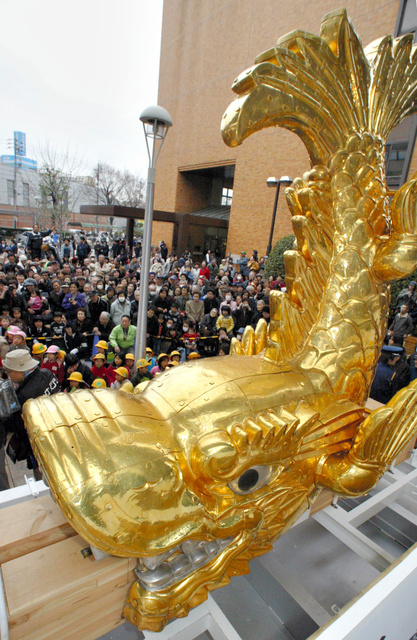金シャチは雌雄一対で、初代は慶長大判1940枚分の金が使われたと伝わる。1945年の空襲で天守とともに焼けたが、59年に復元された。2体とも高さ約2・6メートルで、計約88キロの18金が使われている。(関謙次)