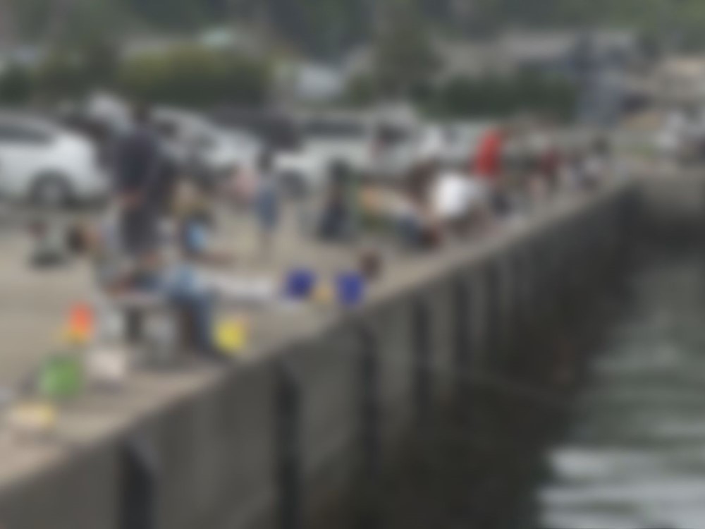 豊浜漁港の岸壁では、狭い間隔で並んで釣り糸を垂らす人たちが…。