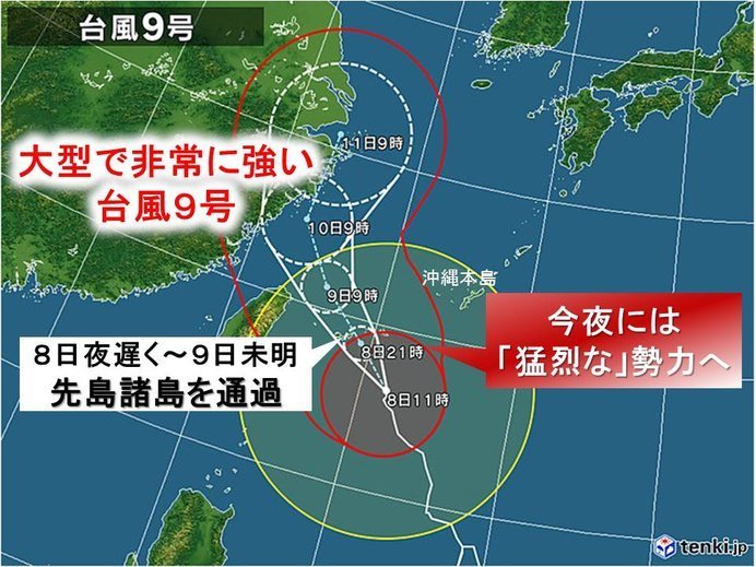 大型で非常に強い台風9号は午前11時現在、石垣島の南東の海上を1時間におよそ15キロというゆっくりとしたスピードで北北西に進んでいます。今夜には「猛烈な台風」に発達し、あす9日の未明にかけて先島諸島を通過する見込みです。その後、あす9日の夜にかけて東シナ海を北上するでしょう。
