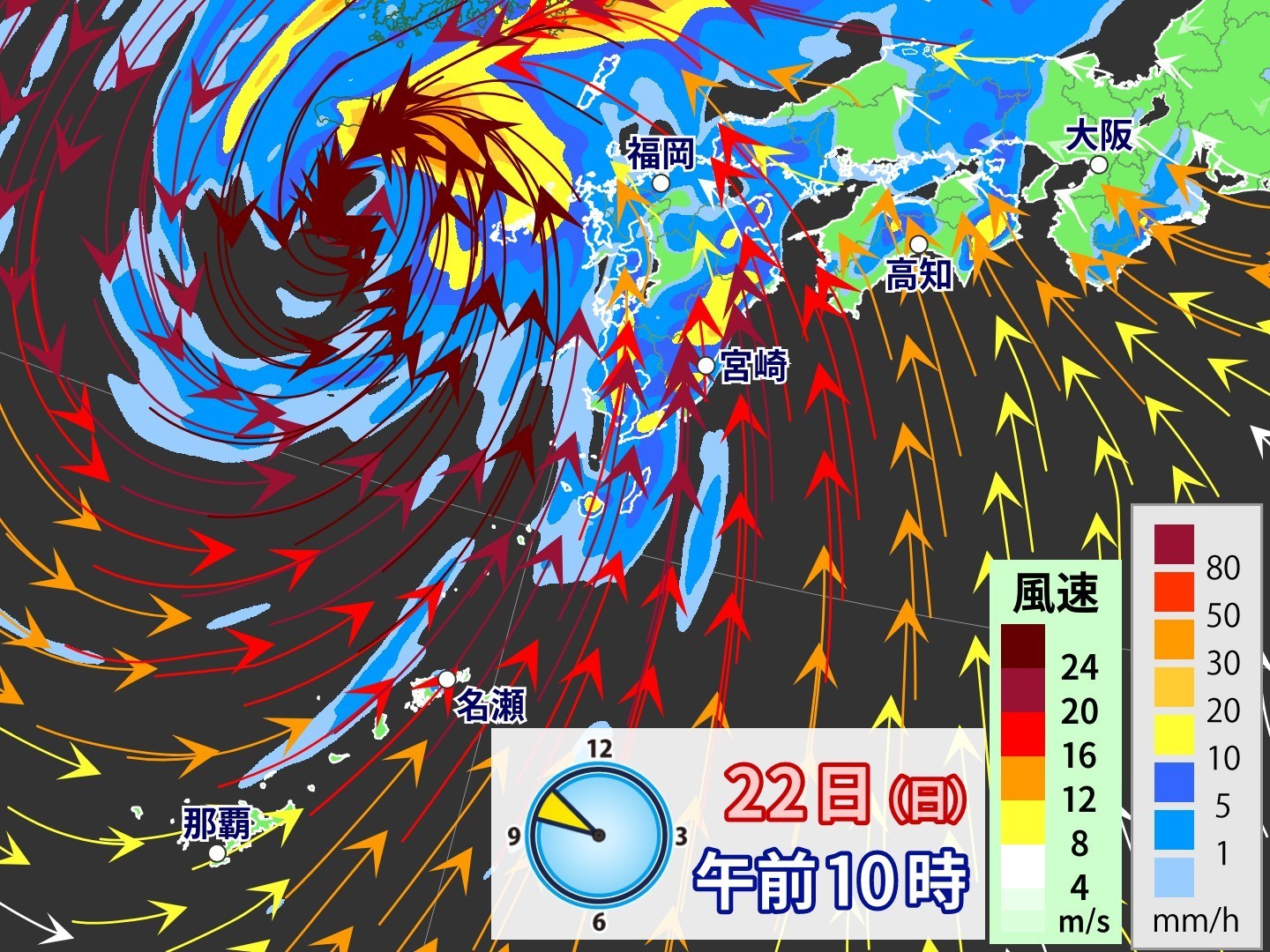 台風本体の発達した雨雲や台風周辺の暖かく湿った空気が流れ込むため、南西諸島や西日本では、22日にかけて雷を伴った非常に激しい雨が降り、大雨となるおそれがある。台風の北上後も南から暖かく湿った空気の流れ込むため、西日本の太平洋側を中心に雨量が多くなる見込みだ。