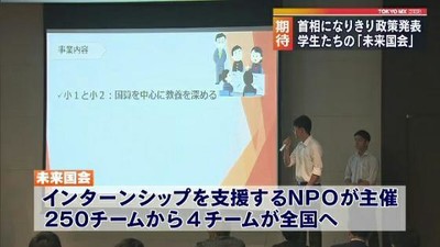 「未来国会」は学生のインターンシップを支援するNPO法人が開いたもので、全国大会には250チームの中から選ばれた4チームの“若き政策集団”が参加しました。