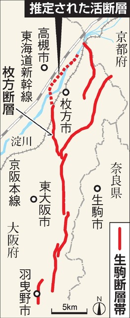 その結果、枚方丘陵の西側を南北に6・5キロにわたって走る枚方断層の北東方向に、ほぼ淀川に沿って8・5キロの新たな活断層があると推定された。枚方断層の延長とみられ、全長は15キロに延びると推定された。大阪北部地震の震源はこの活断層の西に位置する。周辺は人口密集地で、JRや私鉄が通る交通の要所だ。もし地震が発生すれば大きな被害が出る恐れがある。
