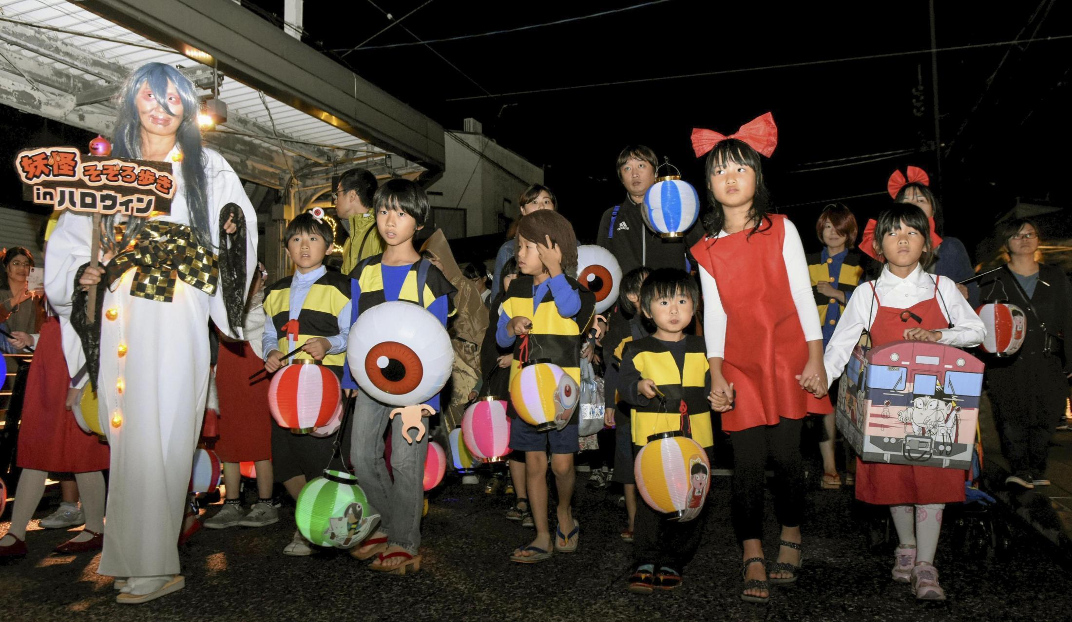 「ゲゲゲの鬼太郎」の作者、故水木しげるさんの出身地である鳥取県境港市の観光スポット「水木しげるロード」で26日、ハロウィーンイベントが開かれ、観光客らが妖怪の仮装で夕闇の中をパレードした。