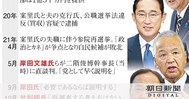 岸田文雄首相が「政治とカネ」で早くも苦しい状況に立たされている。2019年の参院選広島選挙区で、自民党本部が提供した1億5千万円をめぐる問題だ。岸田首相の地元では解明に期待が高まるが、新政権の後ろ盾とされる安倍晋三元首相ら大物も絡む。「板挟み」となった岸田首相の言い回しはあいまいで、衆院選へのダメージを懸念する声も漏れる。