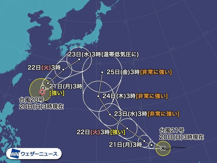 台風20号は沖縄本島地方と大東島地方の間を進み、22日(火)頃の東日本の天気に影響を及ぼす可能性があります。台風21号は今後非常に強い勢力に発達し、小笠原諸島に近づくおそれがあります。