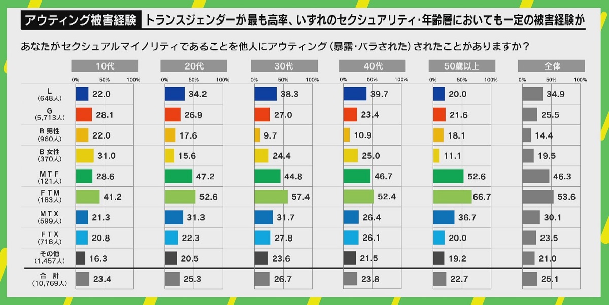 個人の性的指向や、性自認を本人の許可なく暴露する行為「アウティング」。そのアウティングを巡り28日、驚きの調査結果が発表された。 【映像】アウティング被害「25%は小さい見積もりの可能性」 宝塚大学の日高庸晴教授が、昨年の9月から12月にLGBTQの当事者約1万人を対象に行った調査によると、全体の25%、約4人に1人が「アウティングをされた経験がある」と回答したという。 この結果について、調査を行った日高教授はこう受け止める。