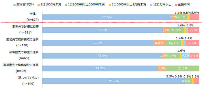 勤務先で診療に従事した勤務医の76.6%、検体採取に従事した勤務医の70.3%が「支給されない」と回答。支給される場合でも金額は1日5000円未満が多かった。 一方、診療や検体採取に携わっていない勤務医でも8.8%は手当が支給されると回答した。