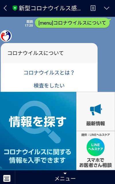 LINE上で「友達」になれば、発生状況や予防法などがわかる。利用者が「コロナウイルスとは?」などと質問すれば、返事が来る。10日からは「LINEヘルスケア」と連携し、感染の疑いのある人がLINE上で無料で医師に相談できるようにする予定という。(栗林史子)