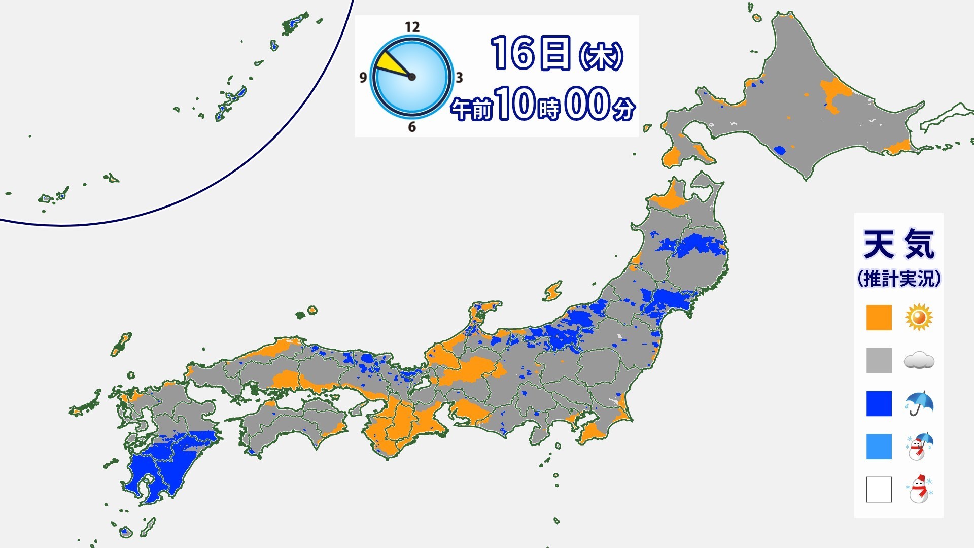 16日は梅雨前線が南下しているため、東海や近畿、中国地方を中心に日差しの出ている所がある。午後も、同じような空模様の続く地域が多いが、九州南部は雨の降りやすい状態が続き、沖縄・奄美は局地的に激しい雷雨のおそれがある。なお、夜以降は紀伊半島や東海、関東南部にかけて雨の降り出す所がありそうだ。