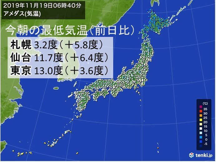 きょう19日は、きのう18日に低気圧や前線に向かって吹いた暖かい南風が残ったため、暖かな朝となった所が多くなりました。朝9時までの最低気温は、北海道から近畿にかけて、きのうの朝よりも5度以上も高くなった所が多くなっています。札幌ではきのうの朝は氷点下でしたが、今朝は3.2度と6度くらい高くなっています。また都心でもきのうは10度を下回りましたが、今朝は13.0度と10月下旬並みでした。また北海道や東北ではきのうの朝よりも10度以上も高くなった所もありました。